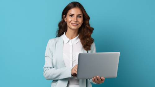 beautiful web developer, 35 Anna, on plain green background, standing to the right of frame, photo real. Canon EOS. --ar 16:9