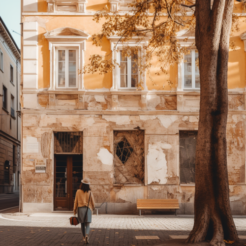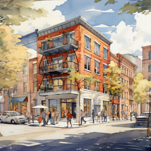 brick building on corner of narrow intersection, renovated first floor that is a food hall with one large glass garage door open facing the street, other side of the building is facing a perpendicular street, people walking on intersections and around building, architectural art style, painting render style, sketch, three story brick old pittsburgh apartments along road, sunny