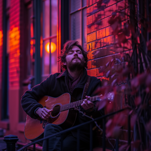 A 35-year-old man with a short square beard, playing guitar, sitting leaning against a red brick building, with vines on the walls. Red and purple aesthetic. Red and purple sunset. --stylize 250 --v 6.0