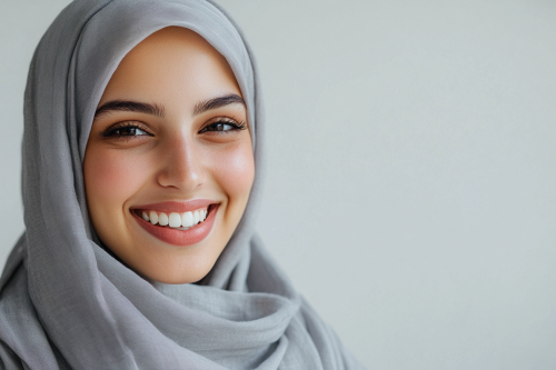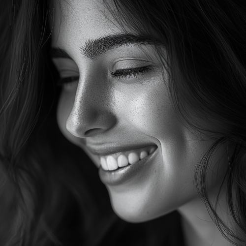 Create an image of a European woman, beautiful face expression, smiling. The image should be black and grey, with studio lighting, high contrast, and very soft shadows. The image should look realistic and capture the entire head down to the shoulders.