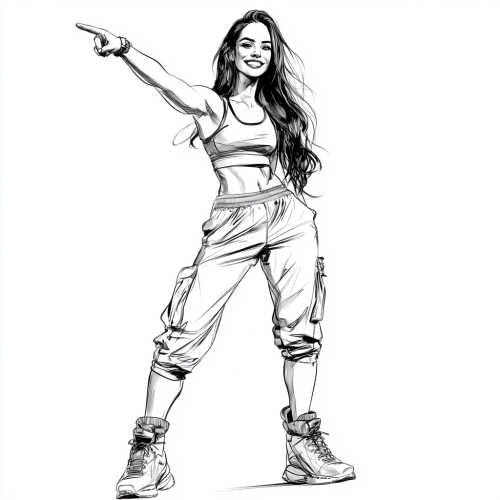 very light black-and white illustration sketch with a vector clear background of beautiful female wearing activewear and boots, smiling knowingly pointing into the air, minimalist, full length