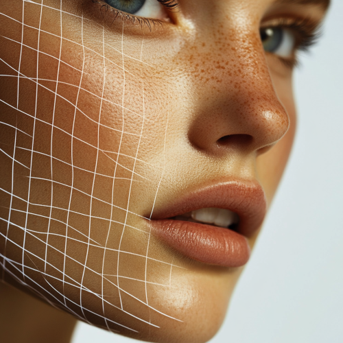woman face, with lights reflecting on her in turquoise and orange tones. Surrealism , realistic, chaotic artistic piece. High contrasts , darks and lights, dynamic composition.
