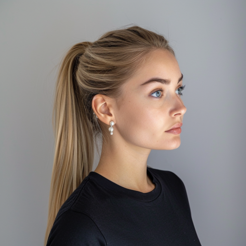 ultra high definition digital photo of a beautiful woman, closeup headshot, 30 years old, blonde with dark blue silvery eyes. Background is plain smooth and she wears a blank t-shirt. Her ears are adorned with large pearls. She has long straight hair with highlights in a ponytail and subtle makeup. Profile view. --v 6.0 --style raw