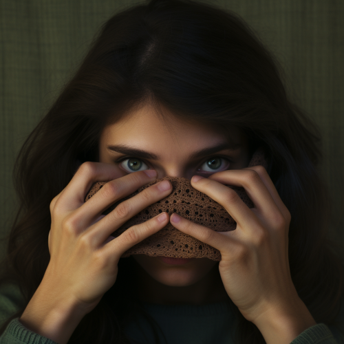 a woman complete covered with a latex suit, just one big eye on her face, sci-fi, pink and red, white background, --v 6.0