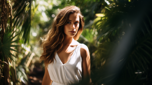 a beautiful woman wearing a white linens dress peering behind leaves in a south florida botanical garden on a sunny day --ar 16:9 --s 50