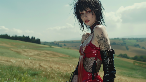 white skin and a fashionable red latex dress and expensive black leather jacket , stockings and darter straps showing under the dress, tattoos, She works in a high-powered corporation. She looks sinister and beautiful, facing forward in a manga, full-body shot, wide-angle shot, dreamlike, whimsical, 80's, full proportions, in the background the sunny countryside of val d'orcia tuscany --chaos 5 --ar 16:9 --style raw