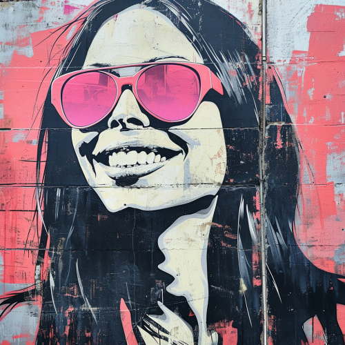 Graffiti a beautiful woman in her 50's with long black straight hair, small round glasses, a long face, and a big smile, style Shepard Fairey --v 6.0