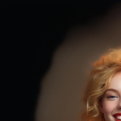 Sharp photorealistic image of a beautiful girl with perfect lips smiling at the camera, showcasing supernatural teeth and pale skin. She's dressed in an ultra-bright reddish dress, her blonde hair blending with golden hues. Parts of her teeth contrast with shadow and vivid texture, set against an opalescent colored background for a 3-dimensional effect. Captured using a Nikon Z9 with