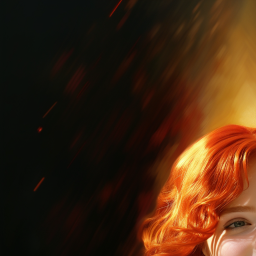 Sharp photorealistic image of a beautiful girl with perfect lips, smiling directly at the camera, revealing supernatural teeth and pale skin. She's adorned in an ultra-bright reddish dress, her hair a blend of red and gold. Parts of her teeth are in stark contrast with shadow and vivid texture, against an opalescent colored background creating a 3-dimensional effect. Photographed using a Nikon Z9 with a 55mm mirrorless lens, the daylight illuminates her face, casting reflections and perfectly capturing the interplay of natural shadow and