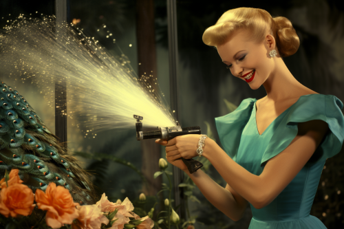 **attractive middle aged blonde woman spraying a peacock with a garden hose, 1950s magazine --weird 20 --ar 3:2 --s 250