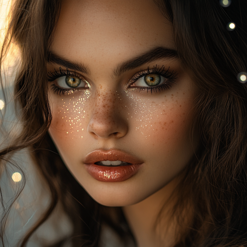 a realistic photo portrait of a beautiful woman facing forward, looking directly at the camera ultra-realistic, real photo, realistic voluminous lips, hair with pores and glitter