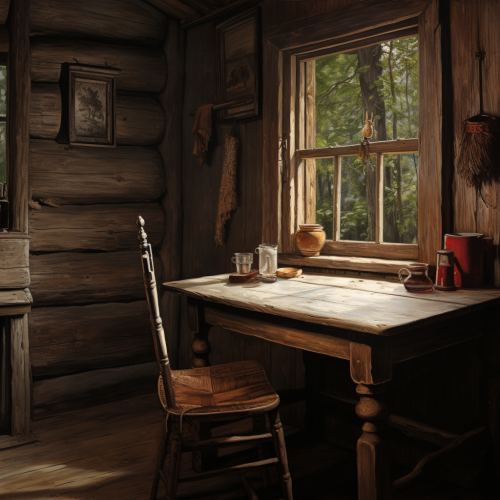 the interior of a little cabin, with a window on the left and a window on the right, a door on the front and a wooden table next to the door, there is a blade on the wooden table. --v 5.2