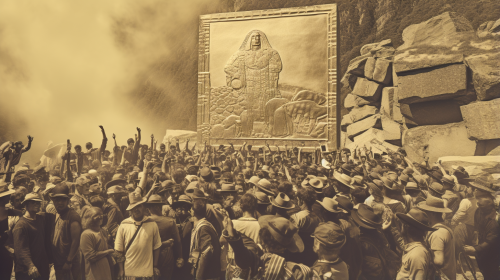 historical retro photo, the Incas worship a huge golden statue of bitcoin at Machu Picchu, sepia toning --ar 16:9
