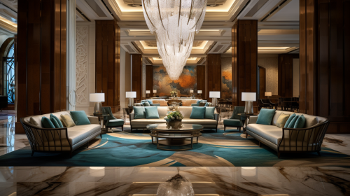 a beautifully designed five star hotel lobby with faux tortoise shell furniture and faux tortoise shell wall panels, cyan, beige and sienna, studio lighting, highly detailed, luxurious --ar 16:9