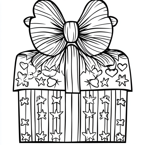coloring page of Christmas gift with a big bow on top, the paper on the gift is in equal stars and hearts. Black lines, white background, easy to color for beginners, The bow is in stripes --no shading