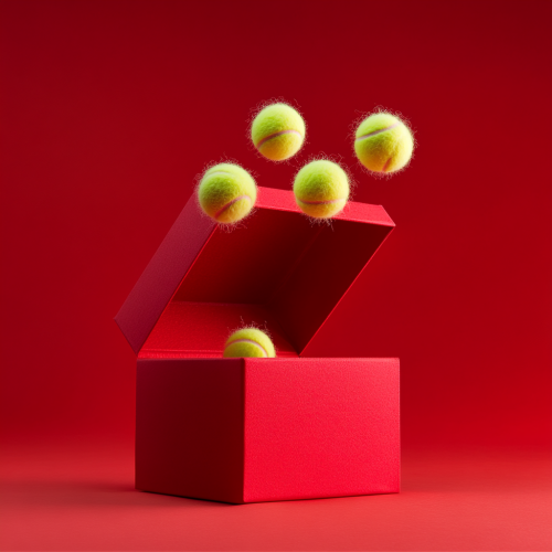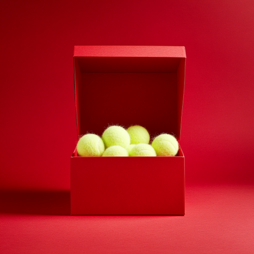 a photo of a simple all red gift box taken in an all red studio background. The lid of the gift box is open and there are 6 fuzzy tennis balls bouncing out of the box. The tennis balls have motion blur path behind them. There is ample space around the box in the center of the photo. The photo is taken from in front of the box. --v 6.1