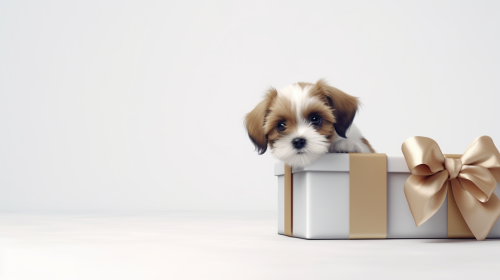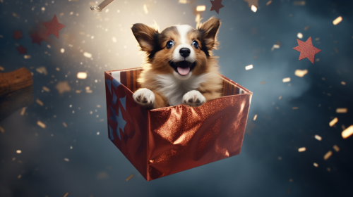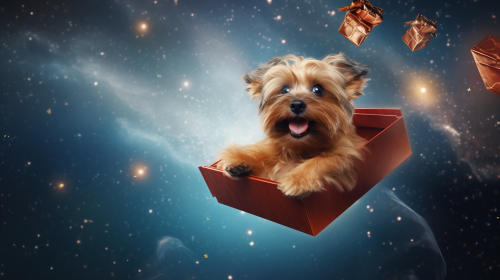 Dog puppy is flying through space in a gift box. Gift bow. The word: BONUS --ar 16:9