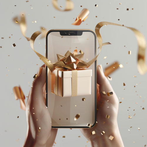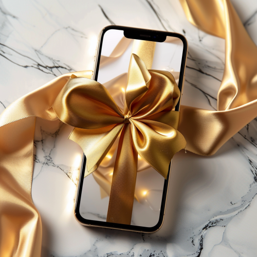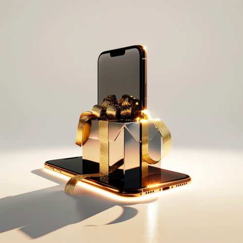 A gift box delivered from the screen of the iPhone 15 to the real world. The gift box is wrapped in beautiful gold ribbon. cinematic lighting. white minimal background. Shot with a commercial camera. --v 6.0