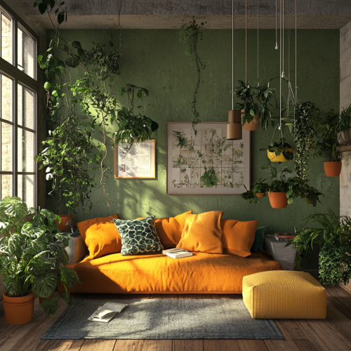 a cosy livingroom with Moss Green, Warm Taupe, Burnt Orange, Creamy White, Charcoal Gray colors and with some hight contrast yellow furniture. plants and a window on the left side with light shining through and the light is shining onto the living space with plants hanging from ceiling and on the floor. 4k resolution high