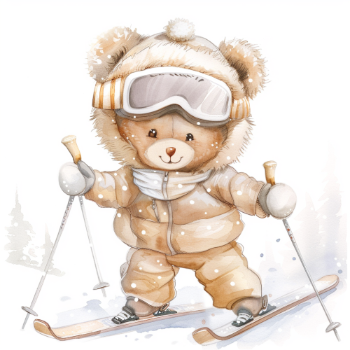 soft warm colors, light brown, beige and white only, neutral for baby clipart, really soft, smooth smiling adorable cute teddy bear professional skier in warm winter clothes skiing clipart, white background