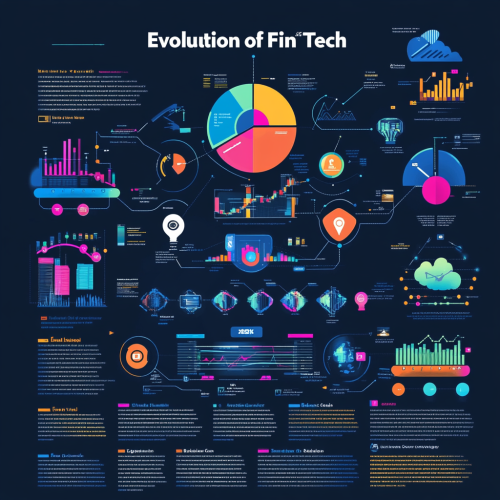 Design a captivating infographic titled "Evolution of FinTech" using a techno style and modern color palette. Infographic Structure: Timeline: Visually represent the evolution of FinTech over time, starting from its early origins to the present day. Key Milestones: Highlight significant milestones and innovations, such as the introduction of ATMs, online banking, mobile payments, blockchain technology, and artificial intelligence in finance. Impact on Financial Services: Showcase how FinTech has disrupted and transformed various financial sectors, including banking, payments, lending, investing, and insurance. Emerging Trends: Highlight the latest trends and technologies shaping the future of FinTech, such as decentralized finance (DeFi), open banking, and embedded finance. Benefits and Challenges: Illustrate the advantages and disadvantages of FinTech adoption for both consumers and businesses. Visual Style: Techno Style: Employ a futuristic and tech-inspired aesthetic, with sleek lines, geometric shapes, and vibrant colors. Modern Color Palette: Use a combination of bold and contrasting colors, such as electric blue, neon green, vibrant orange, and deep purple. Dynamic Illustrations: Incorporate eye-catching illustrations and icons to represent key FinTech innovations and concepts. Data Visualization: Use charts, graphs, and other visual elements to present data and statistics effectively. Overall Tone: Informative and Engaging: Present the information in a clear, concise, and easily understandable manner. Visually Appealing: Utilize a modern and visually stimulating design to capture the essence of the FinTech revolution. Forward-Looking: Highlight the transformative potential of FinTech and its impact on the future of finance.