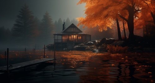 cottage, fall vibes, orange trees, foggy, floating ghosts, 4k --ar 128:69