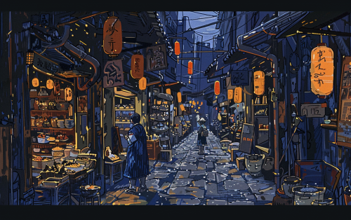 In the style of studio ghibli, a busy city market with someone purchasing from a merchant. Dark with blue tones and orange highlights. Hopeful but post apocyliptic --ar 8:5