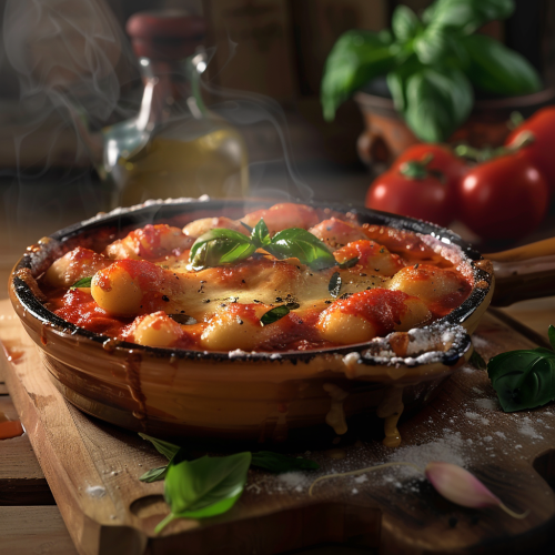 A rustic Italian kitchen setting with a freshly baked dish of gnocchi alla sorrentina. The gnocchi is golden and bubbling with melted mozzarella, surrounded by a vibrant tomato sauce. Fresh basil leaves and a drizzle of olive oil add a finishing touch, capturing the essence of authentic Italian cuisine. --s 50 --v 6.0