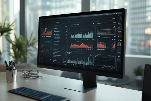 A sophisticated office setting with a desktop screen showing a digital marketing dashboard, background blurred with minimalistic decor, natural daylight filtering through, smooth gradients and soft shadows, calm and inviting tones --ar 16:9 --v 6.0