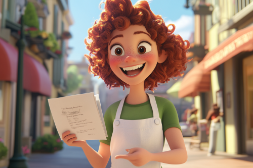 A cartoon character, with curly red hair, brown eyes and wrinkles, wearing a white apron over a green t-shirt, smiling happily with shining eyes, handing out flyers on the street. --ar 3:2 --s 50