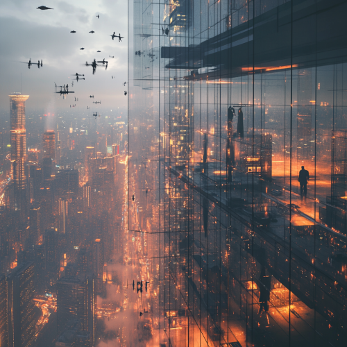 How does Beijing look in the distant future, fascinating, 7000s, creative, realistic, photographic of Beijing city, incredible, street 3D rendering, different perspective, people, city lights, flying people, flying cars, robot dogs