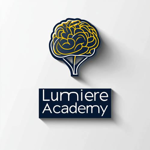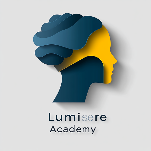 I want a wordmark, 3d minimal, abstract, mental health, vector logo "Lumiére Academy", monochrome palette blue, yellow and grey colours, white background, high resolution, 4k, high contrast, colour grading