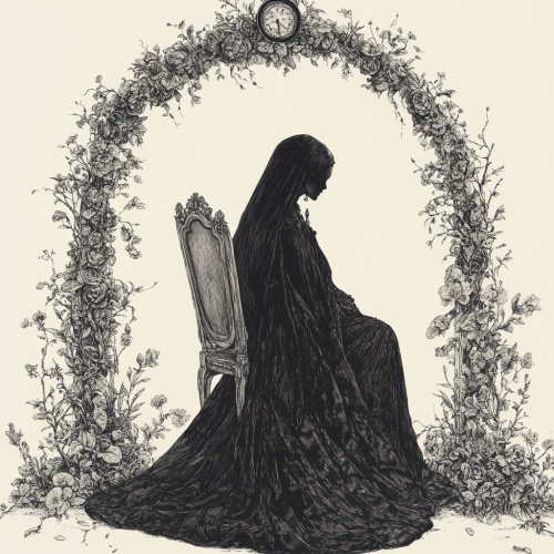 Create a surreal and melancholic illustration in the style of Edward Gorey, depicting a serene figure seated on an ornate chair beneath a delicate arch decorated with intricate flowers. Use meticulous cross-hatching to render the folds and drapery of the flowing black gown, emphasizing the texture and depth. The character should have a calm, detached expression, her posture elegant yet slightly rigid, evoking Gorey's signature stillness and emotional ambiguity. Keep the background minimal, allowing negative space to create a sense of quiet tension. Surround the arch with subtle botanical elements, balancing their delicate beauty with the figure's still presence. Introduce symbolic motifs subtly--perhaps a shadow suggesting a clock or a fallen petal--hinting at themes of fleeting time or hidden emotions. Focus on fine details and minimalist composition to blend elegance with an eerie, dreamlike atmosphere, staying true to Gorey’s haunting aesthetic.
