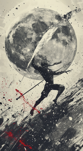 athlete throwing javelin on the moon, simple monochrome drawing style with red and gols splashes, dramatic composition, exploding crystalline space, thousands astheroids, dramatic, in the style of Zdenek Burian, sun set background --ar 35:64 --v 6.0
