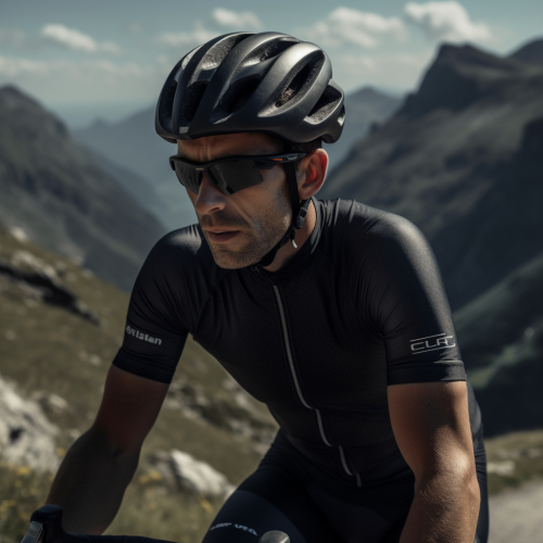 Emmanuel Macron, wearing professional cycling gear, riding a high-performance road bike through a mountainous landscape. The mountains are majestic, with sharp peaks, green valleys, and clear skies in the background. He is pedaling with determination, sweat on his forehead, under a bright midday sun, surrounded by breathtaking scenery. The scene is dynamic, capturing the movement and energy of the ride, with the realism of a high-resolution photograph --v 5.0 --s 250