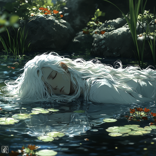 an image of a creature that is half man-half white serpent lying partially in the water on the banks of a spring. Has long white hair floating in the water. anime style --s 750
