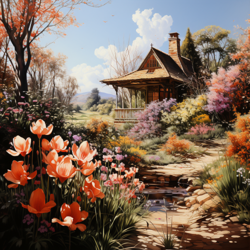 **beautiful spring flower garden painting in the background is a white gazebo, ar 16:9, --s 750 --v 5.2