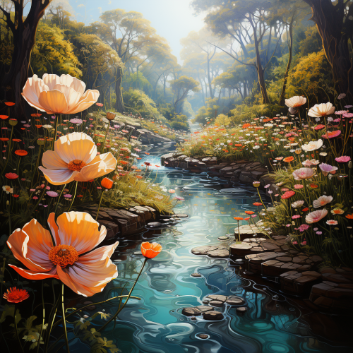 **beautiful spring flowers, the the background is a beautiful detailed airbrushed painting of a beautiful detailed garden, very realistic flowers, ar 16:9, ~~v5.2 --s 750 --v 5.2