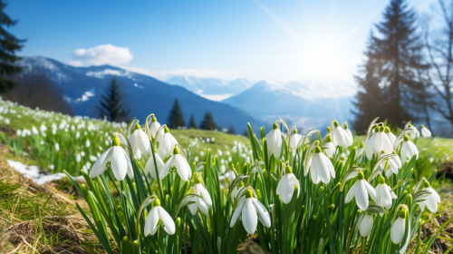 photo of beautiful snowdrops in spring, mountains at the background --ar 16:9