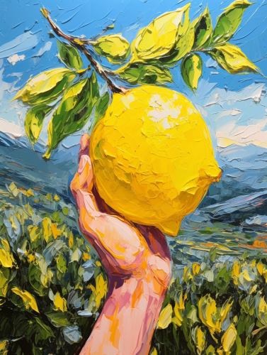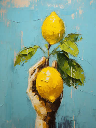 a big coveted lemon in a hand, Bold brush stroke acrylic painting style , acrylic touch, spring season --ar 3:4