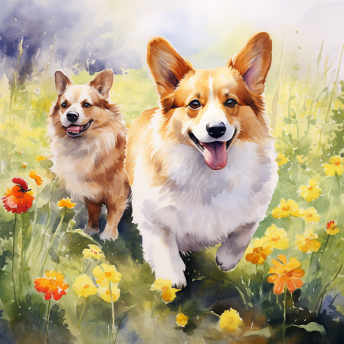 a watercolor painting of a corgi and a chicken walking together through a spring meadow