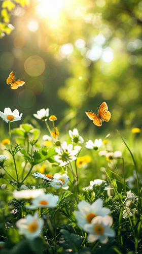 Easter spring background with forest meadow with white spring flowers and yellow butterflies on a sunny day. Easter morning sun sunny spring flower sky flower spring butterfly easter anemone space landscape grass may April field forest white background sunlight nature light morning meadow summer floral beautiful beauty blossom colours fresh season bloom closeup trees --ar 9:16 --stylize 250 --v 6.0
