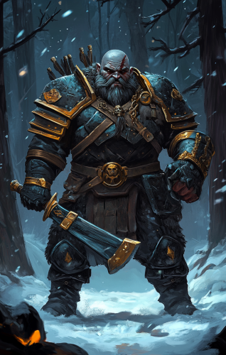 trading card dungeons and dragons character design, young woman warrior dwarf with A giant Axe,warm color palette, Frank thorne artwork --v 6.1 --ar 9:16