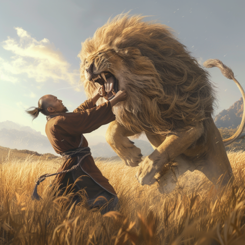 Depict a Chinese Shepard man wringing a huge lions neck in a pasture. Use good ambient occlusion and make the image high resolution. --v 6.0