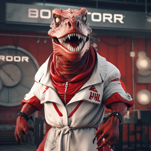 an image of a buff dinosaur with an apron, in the style of toonami, 8k resolution, zeiss ikon zm, futuristic robots, urban decay, album covers, dark crimson and white