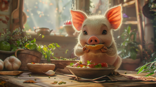 A charming scene of a cute baby pig eating a meal in a cozy home, inspired by the whimsical style of Hayao Miyazaki. The baby pig is sitting at a small wooden table, happily munching on its food, with big, round eyes and a joyful expression. The room is warm and inviting, filled with soft light, rustic furniture, and nature-inspired details like plants and wooden beams. The soft colors and detailed textures give the scene a magical, peaceful atmosphere, capturing the gentle, heartwarming spirit of Miyazaki's films. --ar 16:9 --stylize 150 --v 6.0