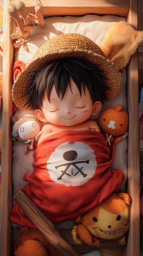 Baby Luffy in an ultra-cute 'uwu' style, peacefully sleeping in a small wooden crib, wrapped in a soft red blanket with tiny straw hat symbols. His chubby cheeks are blushing, and a gentle glow of haki surrounds him like a protective aura. In his arms, he holds a small, orange fox plush toy, and nearby, a Luffy plush from One Piece is perched with a comically oversized piece of meat. The crib is surrounded by plush toys shaped like pirate tools, with pastel colors creating a warm, cozy atmosphere. 8K, HDR, high quality, --ar 9:16