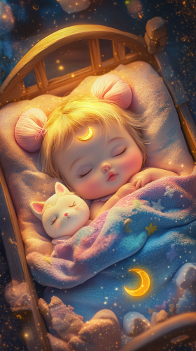 Baby Sailor Moon in an ultra-cute 'uwu' style, peacefully sleeping in a small wooden crib, wrapped in a soft pink and blue blanket with tiny crescent moon symbols. Her chubby cheeks are blushing, and a gentle glow of magical energy surrounds her like a protective aura. In the crib, she cuddles her cat, Luna, depicted as a plush toy. The crib is surrounded by small plush toys shaped like magical girl items, with pastel colors creating a warm, cozy atmosphere. 8K, HDR, high quality, --ar 9:16