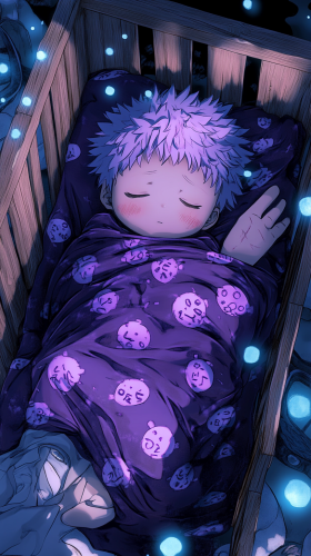 Baby Sukuna from Jujutsu Kaisen in an ultra-cute 'uwu' style, peacefully sleeping in a small wooden crib, wrapped in a soft dark purple blanket with tiny cursed energy symbols. His chubby cheeks are blushing, and a gentle glow of cursed energy surrounds him like a protective aura. In the crib, he cuddles a plush finger, reminiscent of his curse marks. The crib is surrounded by small plush toys shaped like Jujutsu Kaisen items, with pastel colors creating a warm, cozy atmosphere. 8K, HDR, high quality, --ar 9:16