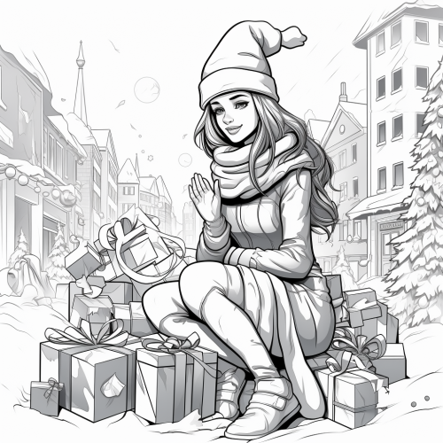 coloring book, illustration for children, christmas, Calvin and Hobbes, detailed scarlet witch wearing christmas hat, christmas presents,snowy christmas city background, dyanmic pose, cinematic shot, no shadows, no colors, clean lines, simple line art, only white --v 5.2